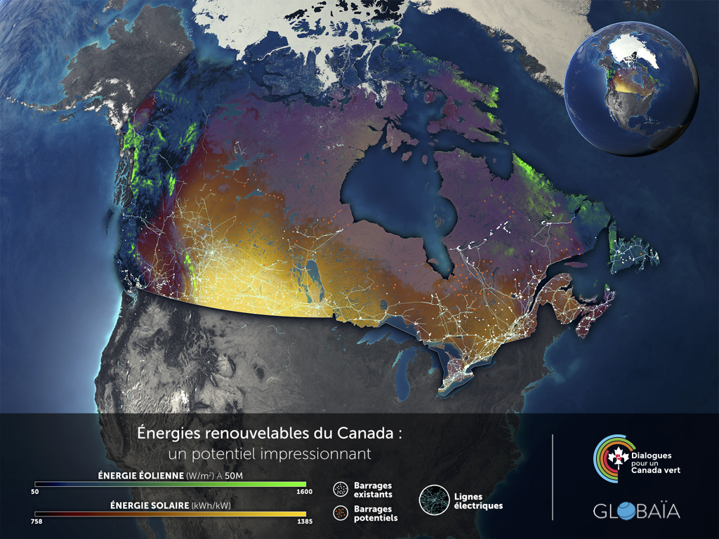 Avec son vaste potentiel en énergies renouvelables, le Canada pourrait atteindre l’objectif d’une production d’électricité 100 % sobre en gaz à effet de serre d’ici 2035. Voir la carte ci-dessous !